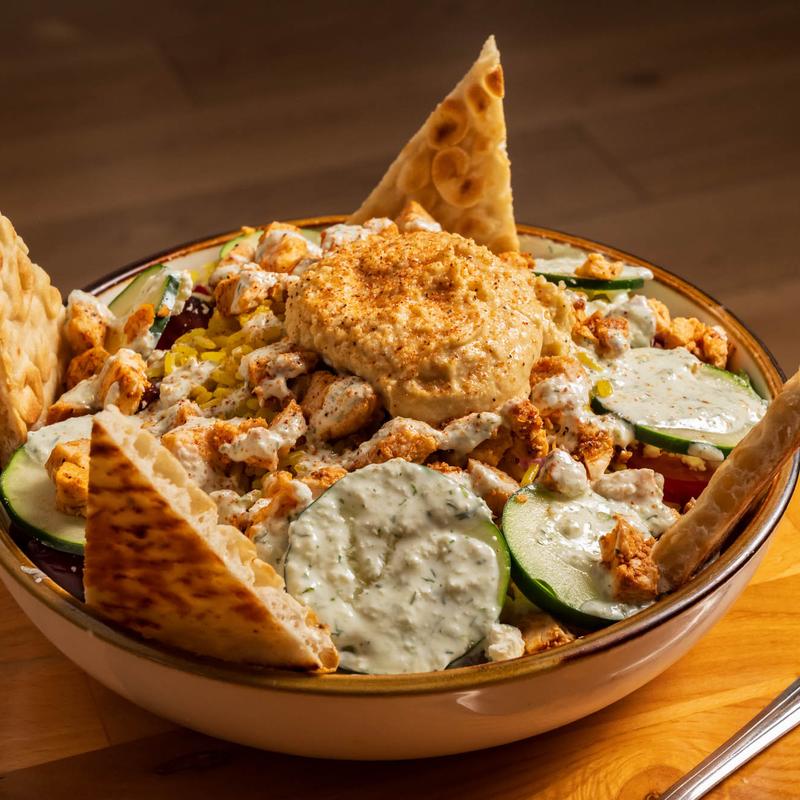 Greens, Greek lemon rice, red onion, olives, tomato, red peppers, cucumbers, feta, hummus and grilled chicken. Served with house-made tzatziki dressing and warm pita bread.