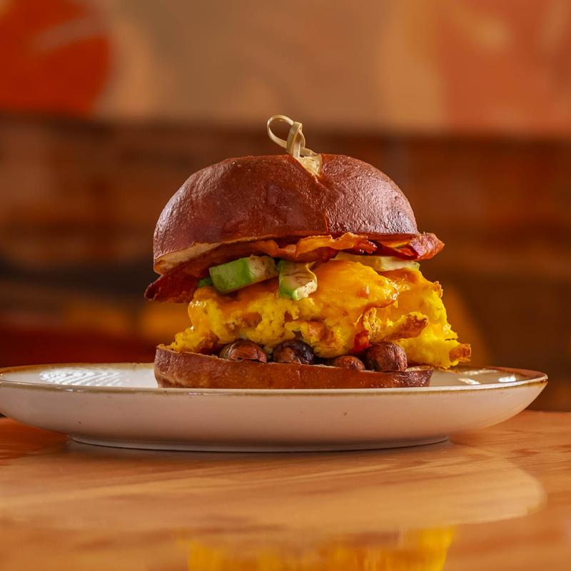 Scrambled eggs, sausage, bacon, sliced avocado, cheddar cheese, served on a pretzel bun. Available as a wrap.